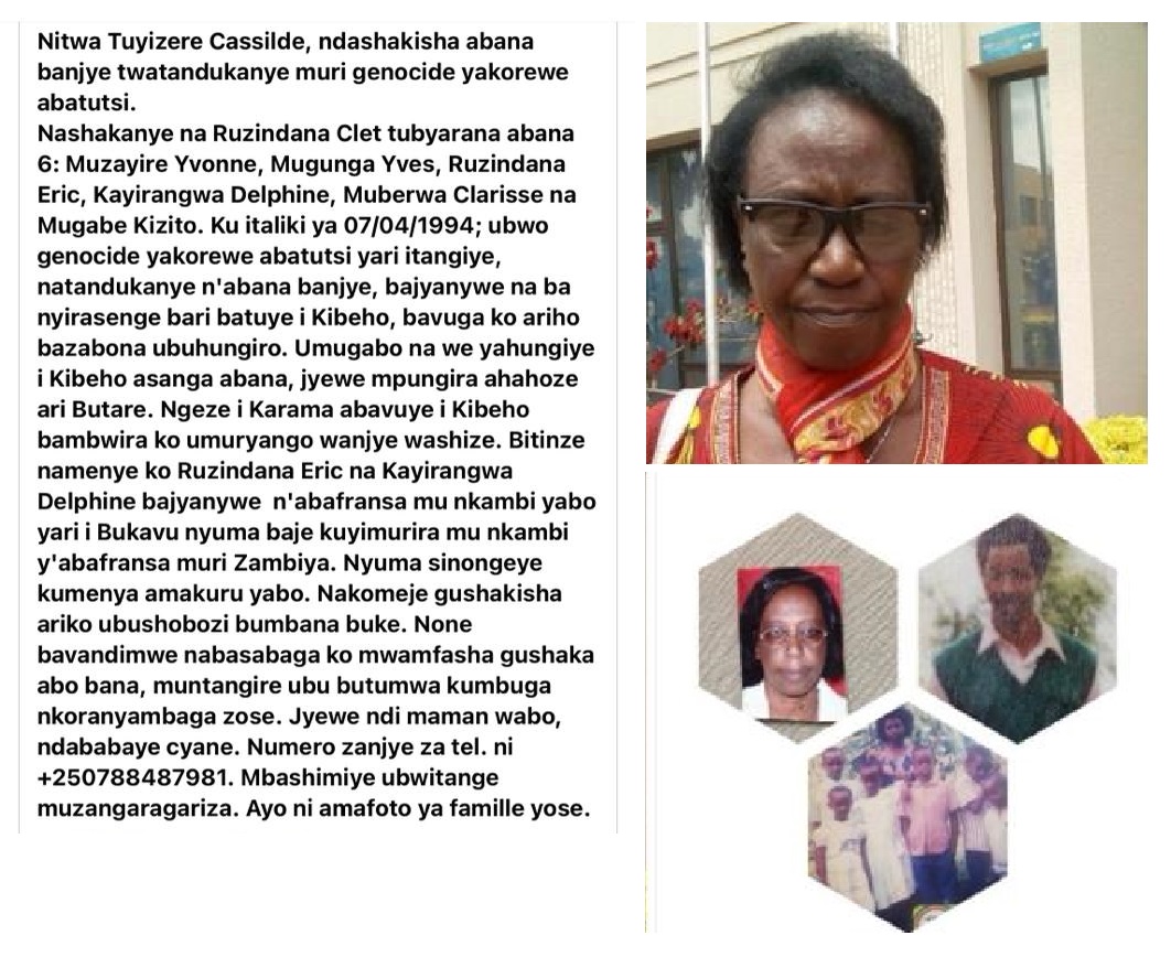 Umubyeyi witwa Tuyizere Cassilde utuye mu karere ka Nyaruguru, ari naho yari atuye mbere ya Jenoside yakorewe Abatutsi mu 1994, amaze imyaka 28 nta makuru azi ku irengero ry’abana be babiri bivugwa ko bajyanywe n’Abafaransa mu nkambi ya Bukavu, nyuma y’uko yari amaze kubwirwa ko umugabo we n’abandi bana bane, biciwe aho bari (…)