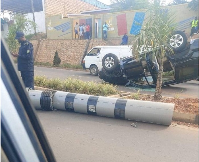 Imodoka ya Prado Land Cruiser igonze Camera yo ku muhanda (bakunze kwita Sophia) irayishwanyaguza iranarimbuka, imodoka na yo igarama mu muhanda, irangirika cyane.