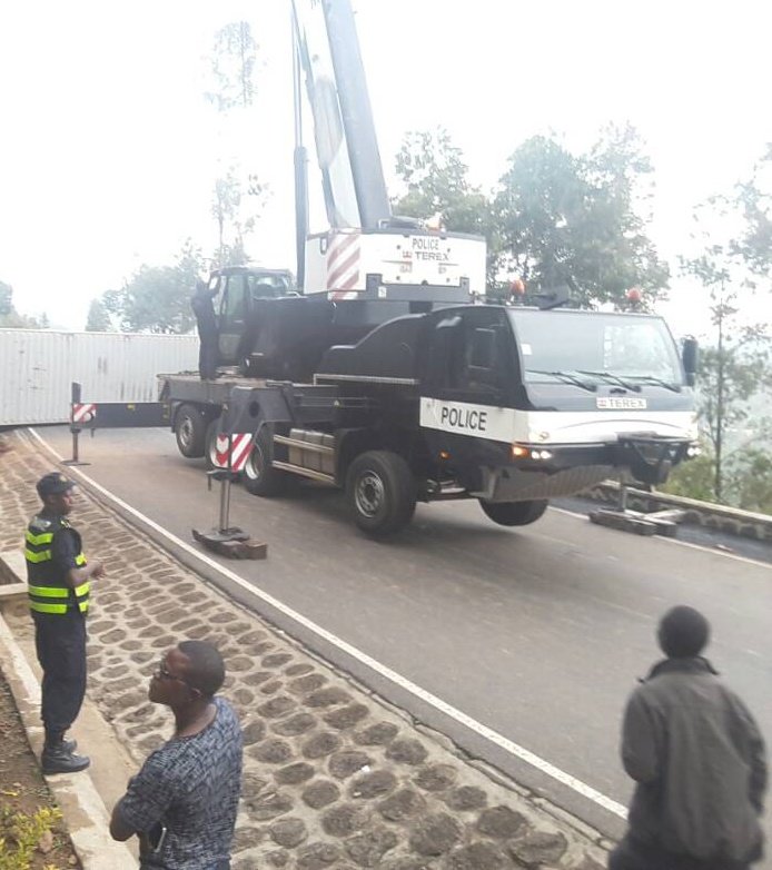 Hifashishijwe imodoka ya Polisi y’Igihugu ikoreshwa mu gutabara ibinyabiziga byakoze impanuka zikomeye, Break Down, Polisi y’igihugu imaze gukura mu muhanda, ikamyo yari yafunze umuhanda Kigali- Musanze