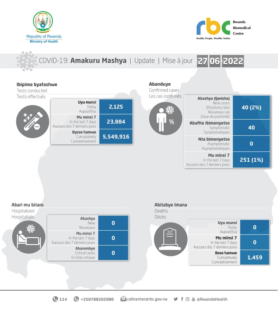 Minisiteri y’Ubuzima (MINISANTE) yatangaje ko ku wa Mbere tariki 27 Kamena 2022 mu Rwanda habonetse abanduye Covid-19 bashya 40, bakaba babonetse mu bipimo 2,125. Abantu 13 muri abo 40 banduye babonetse i Kigali, 8 baboneka i Huye, 6 i Karongi, 4 i Burera, 3 i Muhanga, 2 i Musanze, umwe i Nyanza, umwe i Rutsiro, umwe i (…)