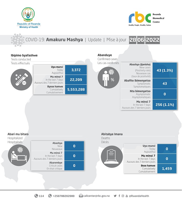 Minisiteri y’Ubuzima (MINISANTE) yatangaje ko ku wa Kabiri tariki 28 Kamena 2022 mu Rwanda habonetse abanduye Covid-19 bashya 43, bakaba babonetse mu bipimo 3,372. Abantu 12 muri abo 43 banduye babonetse i Kigali, 7 baboneka i Musanze, 7 i Muhanga, 5 i Karongi, 4 i Huye, 3 i Rusizi, 2 i Rubavu, 2 i Kamonyi n’umwe i (…)