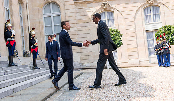 Perezida Paul Kagame uri mu Bufaransa yakiriwe na mugenzi we Emmanuel Macron mu ngoro akoreramo ya Elysée.