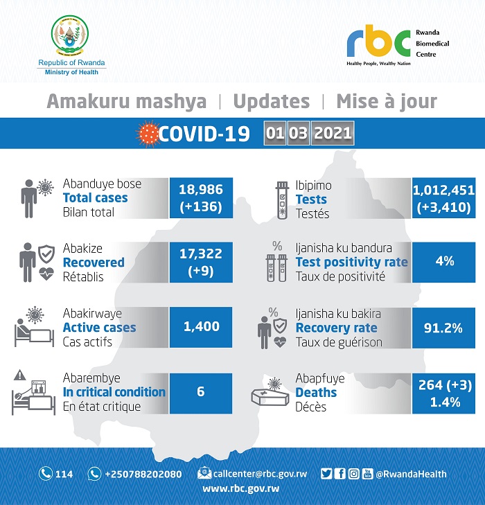 Minisiteri y’Ubuzima yatangaje ko ku wa Mbere tariki 01 Werurwe 2021, mu Rwanda abantu icyenda bakize COVID-19. Habonetse abanduye bashya 136, bituma abakirwaye bose hamwe baba 1400. Abagabo batatu b’imyaka 83, 79 na 61 bitabye Imana i Kigali, abarembye bakaba ari batandatu, nk’uko imibare ibigaragaza.