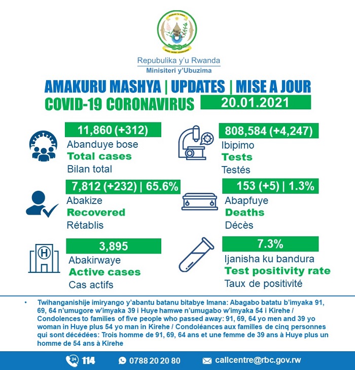 Minisiteri y’Ubuzima (MINISANTE) yatangaje ko ku wa Gatatu tariki 20 Mutarama 2021, mu Rwanda abantu batanu bitabye Imana bishwe na COVID-19.