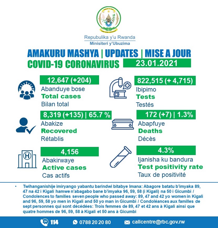 Minisiteri y’Ubuzima (MINISANTE) yatangaje ko ku wa Gatandatu tariki 23 Mutarama 2021, mu Rwanda abantu barindwi bitabye Imana bishwe na COVID-19.