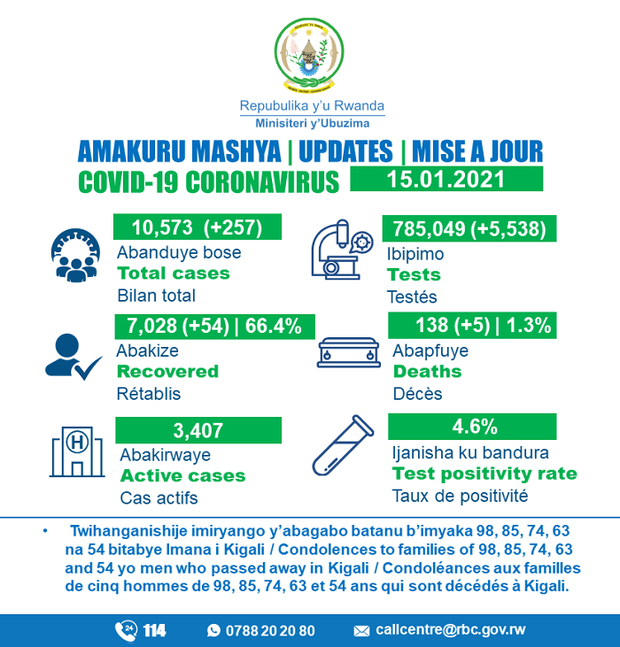 Minisiteri y’Ubuzima (MINISANTE) yatangaje ko ku wa Gatanu tariki 15 Mutarama 2021, mu Rwanda abantu batanu bitabye Imana bishwe na COVID-19.