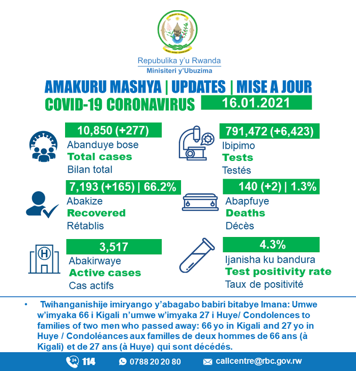 Minisiteri y’Ubuzima (MINISANTE) yatangaje ko ku wa Gatandatu tariki 16 Mutarama 2021, mu Rwanda abantu babiri bitabye Imana bishwe na COVID-19.