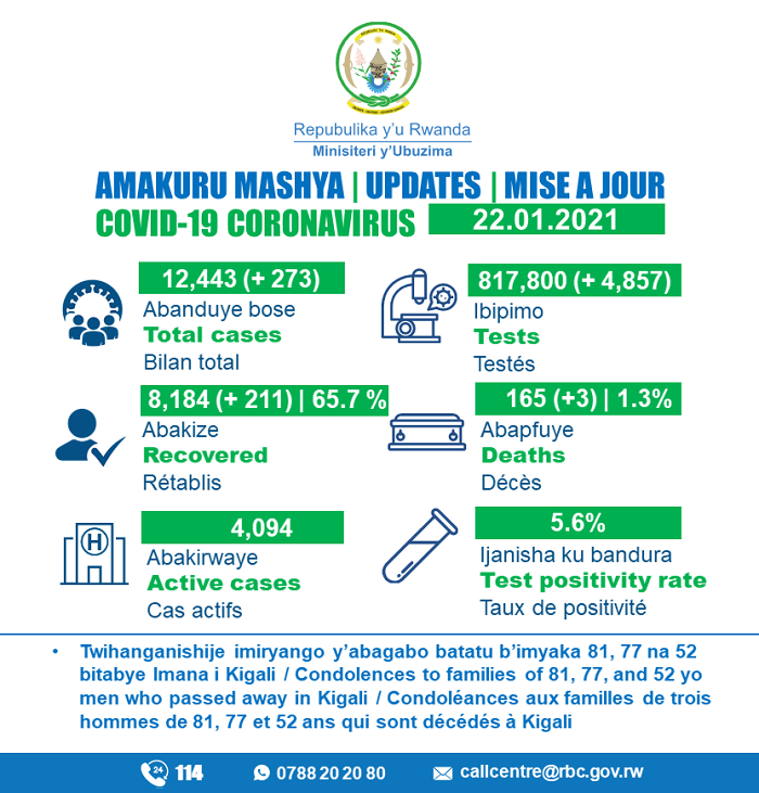 Minisiteri y’Ubuzima (MINISANTE) yatangaje ko ku wa Gatanu tariki 22 Mutarama 2021, mu Rwanda abantu batatu bitabye Imana bishwe na COVID-19.