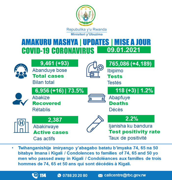 Minisiteri y’Ubuzima (MINISANTE) yatangaje ko ku wa Gatandatu tariki 09 Mutarama 2021, mu Rwanda abantu batatu bitabye Imana bishwe na COVID-19.