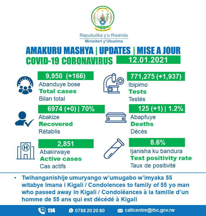 Minisiteri y’Ubuzima (MINISANTE) yatangaje ko ku wa Kabiri tariki 12 Mutarama 2021, mu Rwanda umuntu umwe yitabye Imana yishwe na COVID-19.