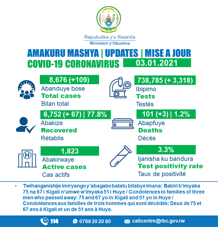 Minisiteri y’Ubuzima (MINISANTE) yatangaje ko ku Cyumweru tariki 03 Mutarama 2021, mu Rwanda abandi bantu batatu bitabye Imana bishwe na COVID-19.