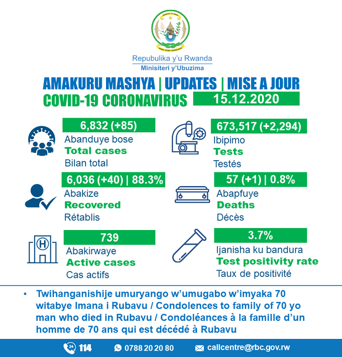 Minisiteri y’Ubuzima (MINISANTE) yatangaje ko ku wa Kabiri tariki 15 Ukuboza 2020, mu Rwanda umugabo w’imyaka 70 y’amavuko yitabye Imana i Rubavu yishwe na Covid-19.