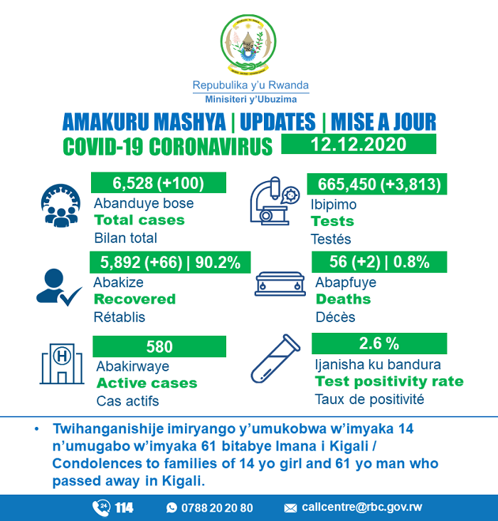 Minisiteri y’Ubuzima (MINISANTE) yatangaje ko kuri uyu wa Gatandatu tariki 12 Ukuboza 2020, mu Rwanda umugabo w’imyaka 61 y’amavuko n’umukobwa w’imyaka 14 y’amavuko bitabye Imana i Kigali bishwe na Covid-19.