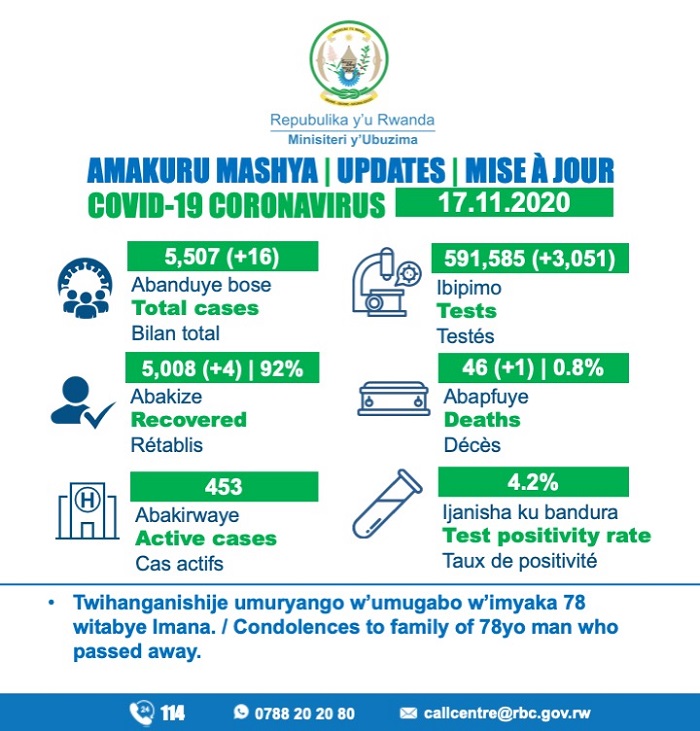 Minisiteri y’Ubuzima (MINISANTE) yatangaje ko kuri uyu wa Kabiri tariki 17 Ugushyingo 2020, mu Rwanda habonetse abantu cumi na batandatu (16) bashya banduye COVID-19, naho abakize ni bane (4).