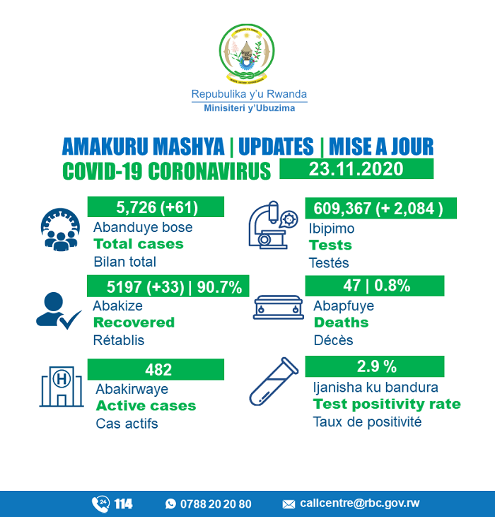 Minisiteri y’Ubuzima (MINISANTE) yatangaje ko kuri uyu wa Mbere tariki 23 Ugushyingo 2020, mu Rwanda habonetse abantu 61 bashya banduye COVID-19, mu gihe abakize ari abantu 33.