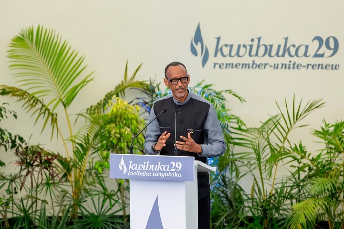 Perezida Paul Kagame ageza ijambo ku bitabiriye ibikorwa byo Kwibuka ku nshuro ya 29 Jenoside yakorewe Abatutsi muri Mata 1994, yavuze ko Abanyarwanda batazigera bongera kwemera icyo ari cyo cyose cyagerageza kubacamo ibice.