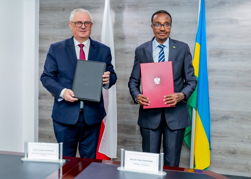 Minisitiri w’Ingabo, Maj Gen Albert Murasira na Minisitiri w’ububanyi n’amahanga wungirije wa Pologne, Pawel Jabłoński bashyize umukono ku masezerano y’ubufatanye mu by’umutekano.
