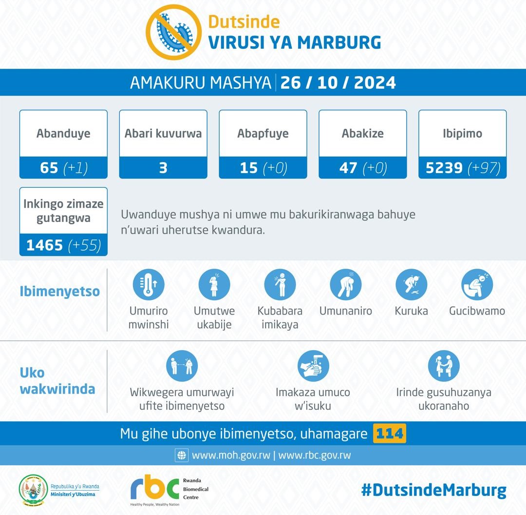 Minisiteri y’Ubuzima yatangaje ko mu bipimo 93 byafashwe kuri iki Cyumweru tariki 27 Ukwakira 2024, byagaragaje ko nta muntu wanduye icyorezo cya Marburg.