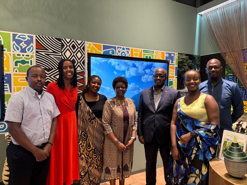 Minisitiri w’Ububanyi n’Amahanga n’Ubutwererane, Amb Olivier Nduhungirehe yasuye aho u Rwanda rurimo kumurikira ibikorwa byarwo muri Expo 2025 Osaka Kansai mu Buyapani, yakirwa na Ambasaderi w’u Rwanda muri icyo Gihugu, Marie Claire Mukasine.