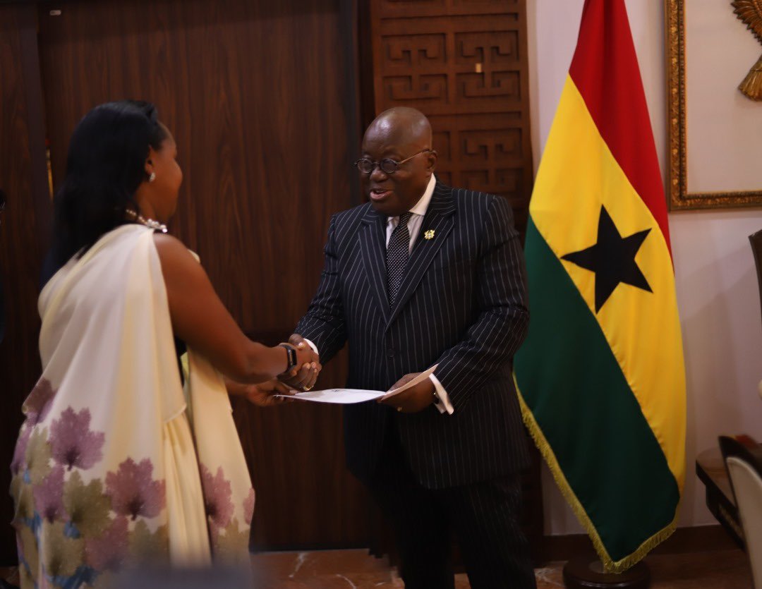 Mbabazi Rosemary, yashyikirije Perezida Nana Akufo-Addo wa Ghana, impapuro zimwemerera guhagararira inyungu z’u Rwanda nka Ambasaderi mushya muri icyo gihugu, yizezwa ubufatanye n’inkunga mu nshingano ze.