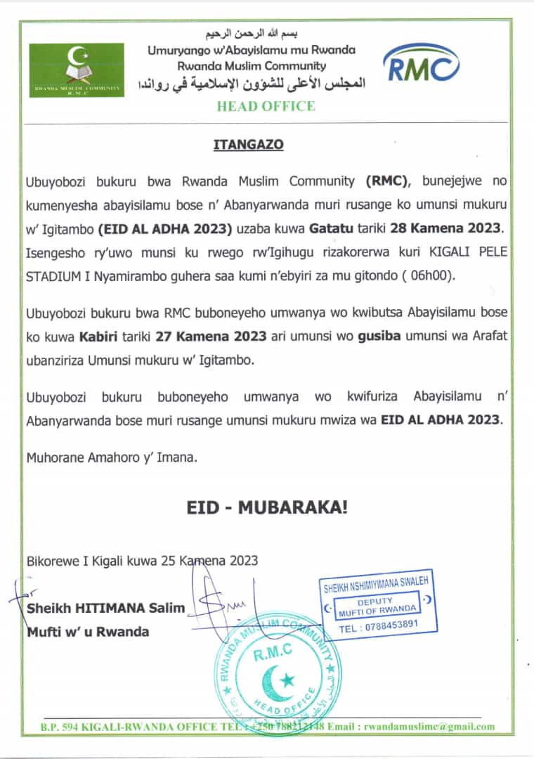 Ubuyobozi bukuru bw’Umuryango w’Abayisilamu mu Rwanda (RMC) bwatangaje ko umunsi mukuru w’igitambo (EID AL ADHA) uzaba kuwa Gatatu tariki 28 Kamena 2023.