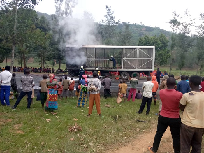 Mu muhanda Kigali - Musanze, ikamyo ya BRALIRWA ifashwe n’inkongi y’umuriro ku mugoroba wo ku cyumweru tariki 25 Kanama 2019, Polisi y’igihugu ishami rishinzwe kuzimya inkongi yihutira gutabara.