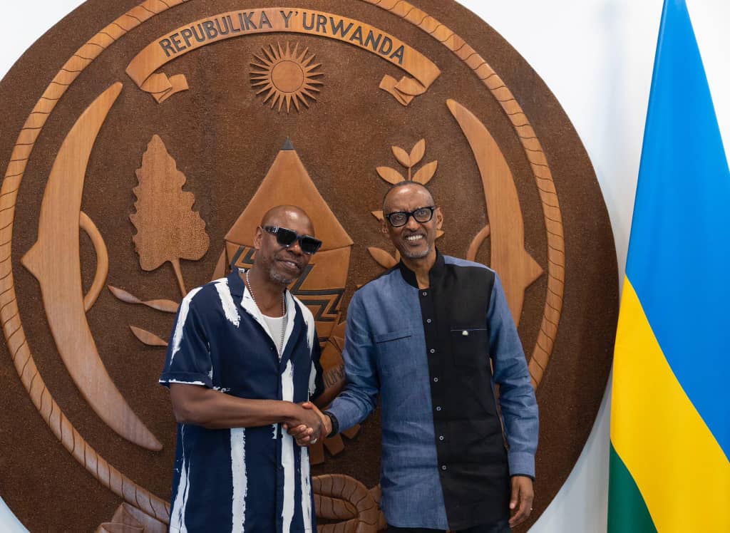 Perezida Paul Kagame yakiriye muri Village Urugwiro, Umunyarwenya Dave Chapelle, ukomoka muri Leta Zunze Ubumwe za Amerika, wataramiye mu Rwanda ku nshuro ye ya mbere.