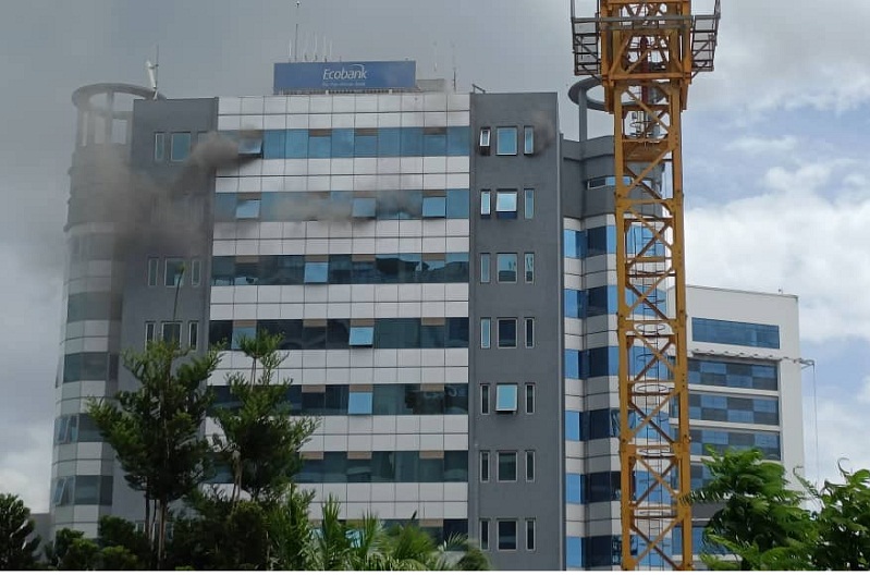 Inyubako ya Ecobank iri mu Mujyi wa Kigali rwagati, ifashwe n’inkongi y’umuriro ku gice cyayo cyo hejuru, iyo mpanuka ikaba ibaye mu ma saa tanu n’igice z’amanywa kuri uyu wa Kabiri tariki 24 Ukwakira 2023.