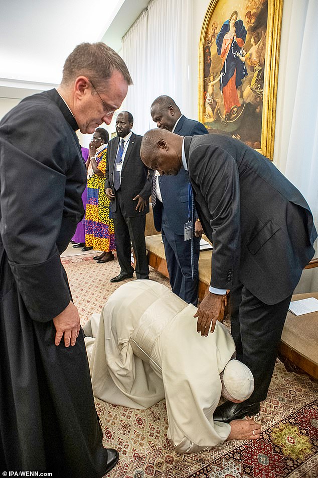 Inkuru yanditswe na Dailymail ivuga ko abari aho batangajwe no kubona Papa Francis w’imyaka 82 y’amavuko, usanzwe ufite n’ikibazo cy’uburwayi mu kuguru, asaba abantu kumufasha gupfukama agasoma inkweto z’abo bayobozi bo muri Sudani y’Amajyepfo, agasoma n’iz’abandi batandukanye bari muri icyo cyumba.