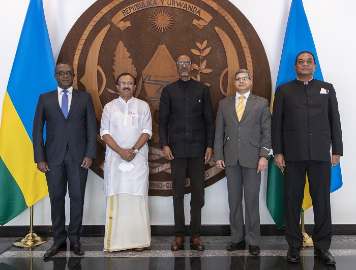 Perezida wa Repubulika Paul Kagame, yakiriye Umunyambanga wa Leta w’Igihugu cy’u Buhinde ushinzwe ububanyi n’amahanga Hon. Shri V. Muraleedharan, mu ruzinduko yagiriye mu Rwanda ku wa Mbere tariki 15 Ugushyingo 2021.