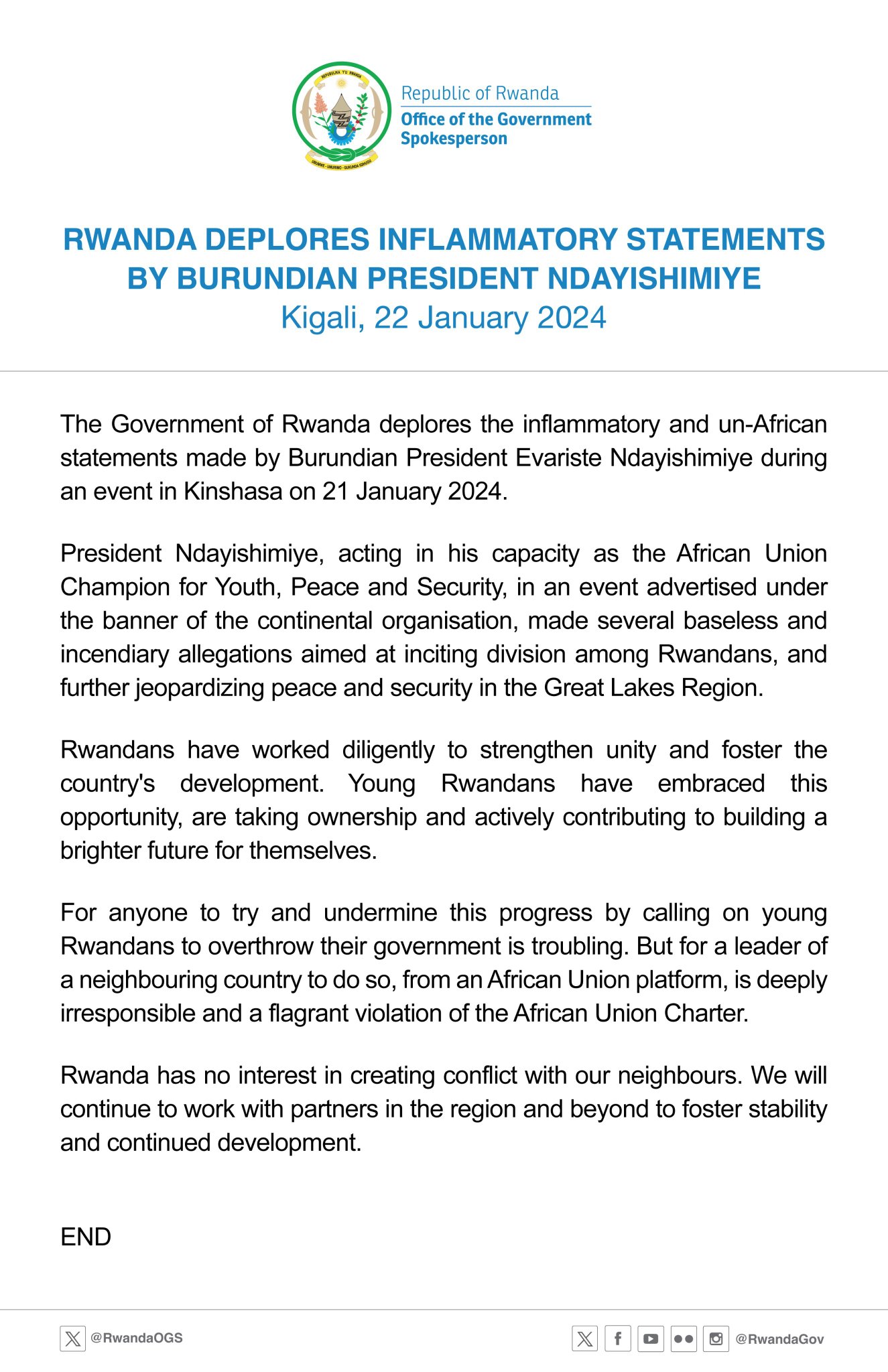Guverinoma y’u Rwanda yamaganye amagambo Perezida w’u Burundi, Evariste Ndayishimiye aherutse kuvugira i Kinshasa muri Repubulika Iharanira Demokarasi ya Congo tariki 21 Mutarama 2024.