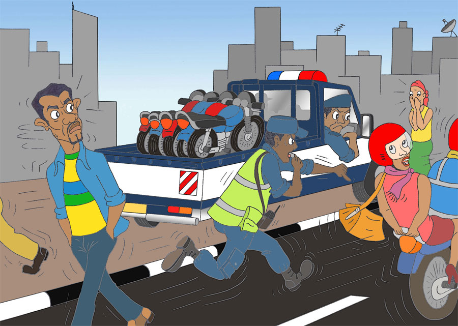 Njye maze kubibona inshuro zirenze nyinshi byarancanze niyemeza kubaza babiri mu bajyama banjye, umwe w’umumotari, n’undi w’umupolisi. Motari yambwiye ko Polisi ibahohotera ikabatwarira ama moto ku maherere iveni (even – kabishywe) n’iyo baba bafite ibyangombwa byuzuye… No komenti! (No comment - Nabuze icyo ndenzaho!) Impamvu ikaba iyihe?... Sijyuwi! (Sinzi!) Polisi nawe arambwira muri aya magambo ati :”Mista, bariya batype bagira amanyanga ateye ubwoba, abenshi ntibaba bazi moto nta n’ibyangombwa byuzuye bafite, abandi baba banyweye ibiyobyabwenge niyo mpamvu mubona impanuka za moto zirirwa zica abantu buri munsi mu mihanda ya Kigali”… Aho naho ntacyo nari kurenzaho kuko ibyo yavugaga nanjye maze kubyibonera, kwanza byanambayeho nk’uko nigeze kubibagezaho muri stori nise “Stamina y’abamotari n’imiguruko” murabyibuka mu minsi ishize igihe moto yari inyirengeje…