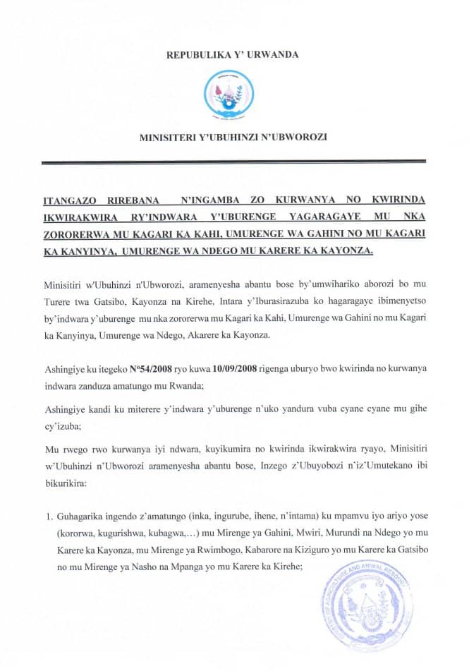 Minisitiri w’Ubuhinzi n’Ubworozi yatangaje ko ingendo z’amatungo (Inka, ingurube, ihene n’intama) ku mpamvu iyo ari yo yose (korora, kugurisha, kubagwa,…) mu mirenge ya Gahini, Mwiri, Murundi na Ndego yo mu Karere ka Kayonza, mu mirenge ya Rwimbogo, Kabarore na Kiziguro yo mu Karere ka Gatsibo no mu mirenge ya Nasho na Mpanga nu Karere ka Kirehe zihagaritswe.