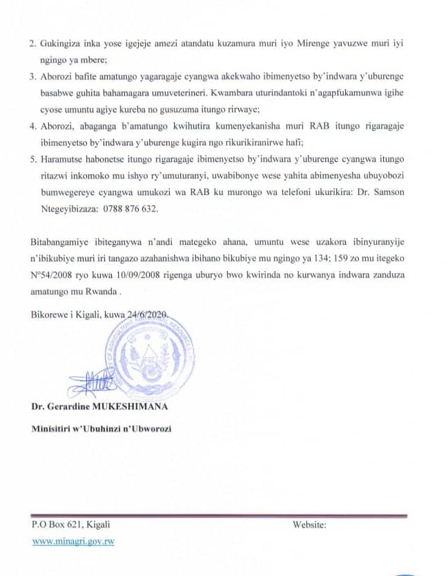 Minisiteri y’Ubuhinzi n’Ubworozi kandi yibukije ko umuntu wese uzakora ibinyuranije n’aya mabwiriza azahanishwa ibihano bikubiye mu ngingo ya 134 na 159 zo mu itegeko no 54/2008 ryo kuwa 10/09/2008 rigenga uburyo bwo kwirinda no kurwanya indwara zanduza amatungo mu Rwanda.