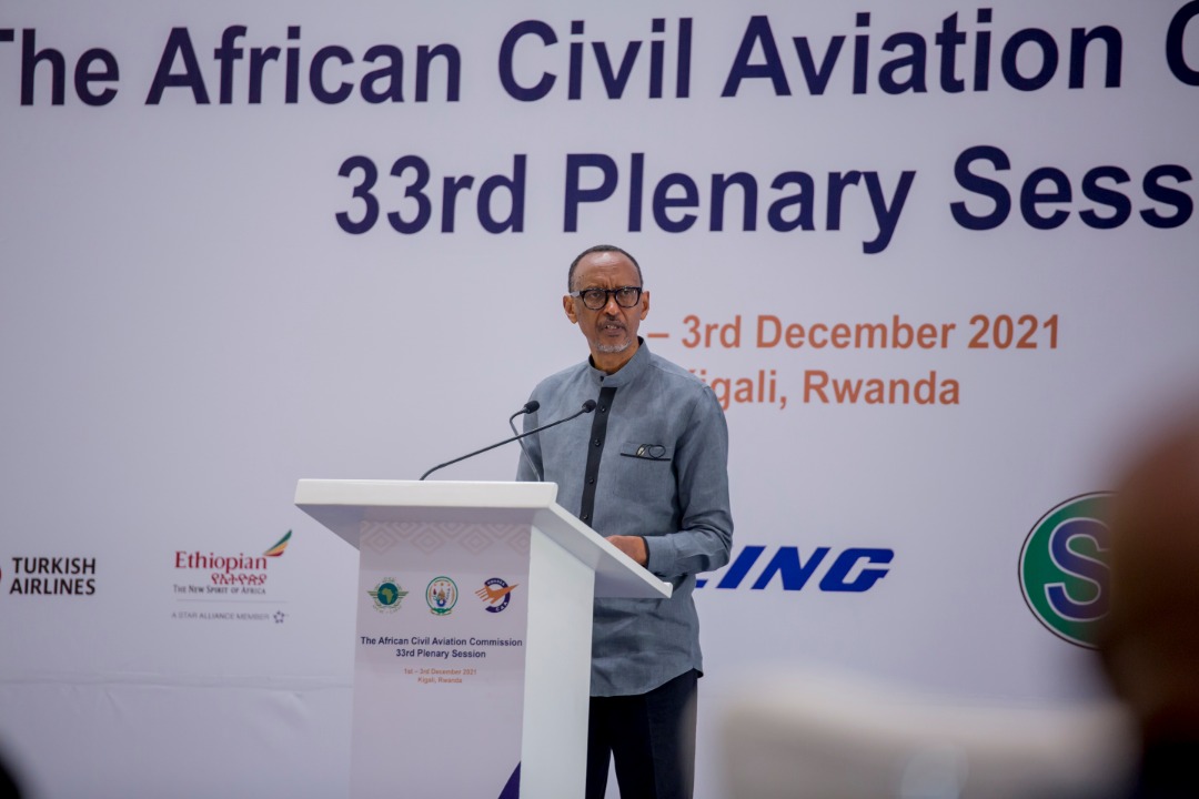 Perezida Kagame yavuze ko gukuraho inzitizi zose zo mu bwikorezi bwo mu kirere zafasha kwigobotora mu buryo burambye, ingaruka z’icyorezo cya Covid-19, bikanoroshya ibikorwa by’isoko rusange ku rwego rwa Afurika.