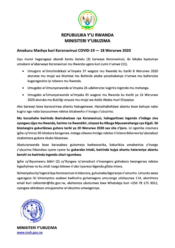 Minisitiri w’Ubuzima Dr Dr Ngamije yabitangaje nyuma y’uko abarwayi ba COVID-19 mu Rwanda bamaze kumenyekana bageze kuri 11 kuri uyu wa Gatatu tariki 18 Werurwe 2020. Mbere yaho ku itariki ya 17 Werurwe 2020 hari hagaragaye undi umwe, yiyongera ku bandi barindwi bagaragaye mbere yaho mu minsi itandukanye.