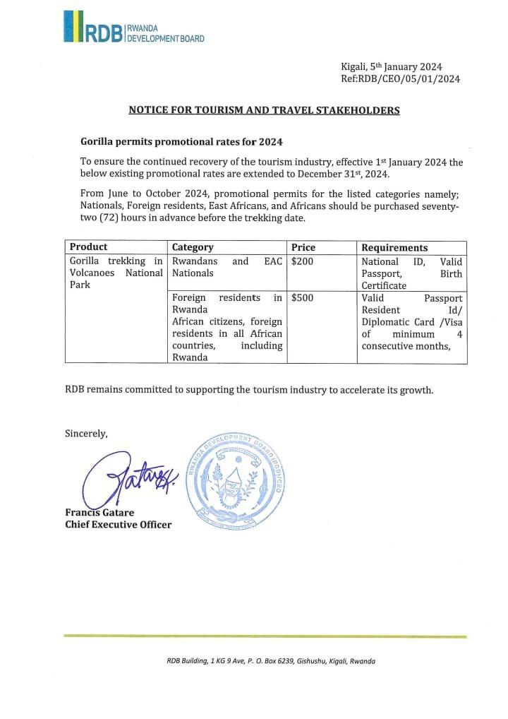 Itangazo rya RDB rigaragaza ibiciro bitandukanye, rikavuga ko mu rwego rwo gukomeza guteza imbere ubukerarugendo, ibiciro byo gusura ingangi ku Banyarwanda no ku baturage ba Afurika y’Iburasirazuba (EAC) byavuguruwe, aho bazajya bishyura amadolari 200 ya Amerika angana na 252,809 frw. Uwo azajya yerekana indangamuntu ye, cyangwa Pasiporo ndetse n’ikigaragaza igihe yavukiye.