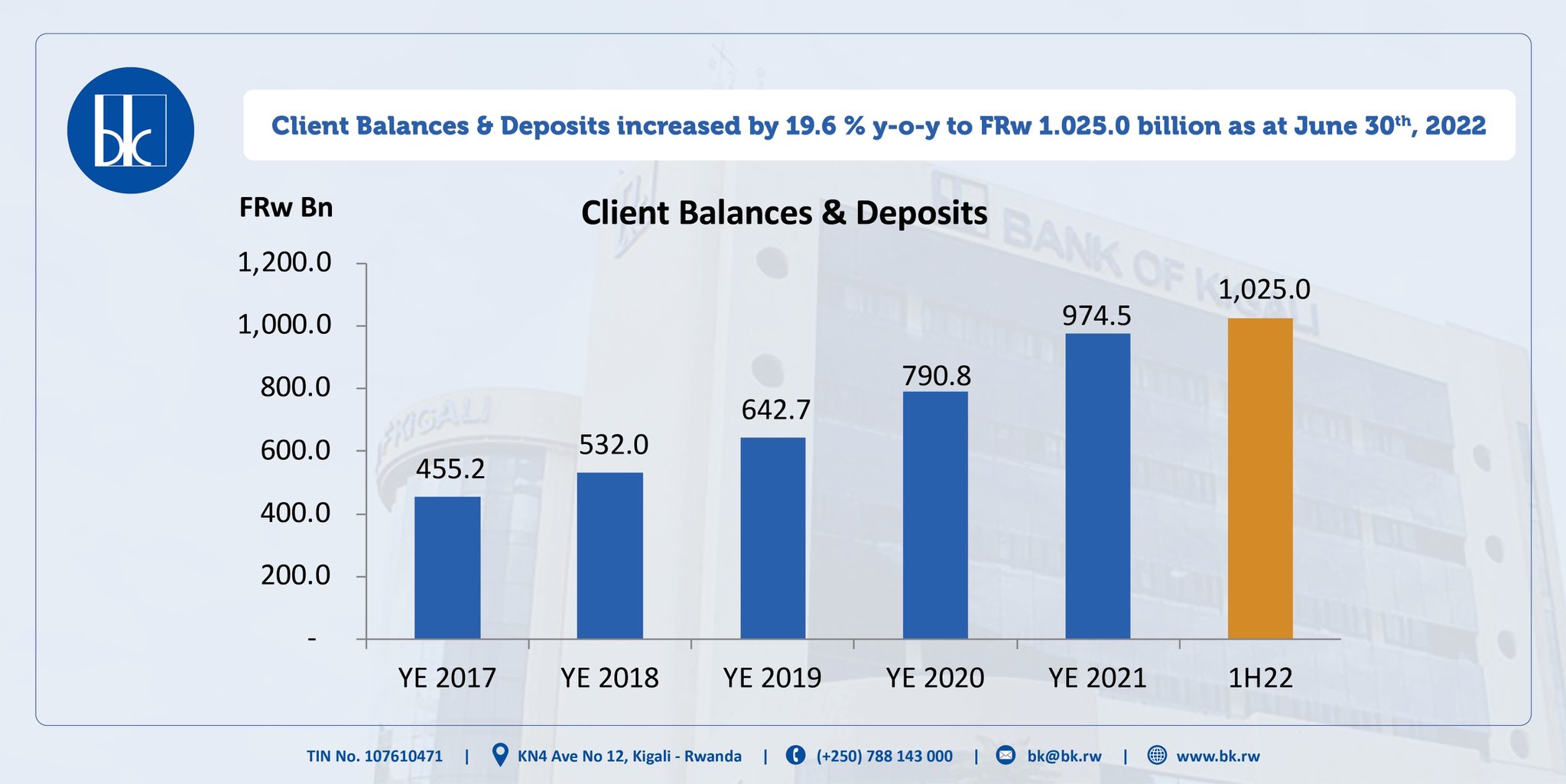 Amafaranga abakiriya babikije kuri Banki na yo yariyongereye mu mezi atandatu ya mbere ya 2022, kuko yavuye kuri miliyari 974 na miliyoni 500 yari yabikijwe mu gihe nk’iki cy’umwaka ushize wa 2022 akagera kuri miliyari 1,025 muri uyu mwaka.
