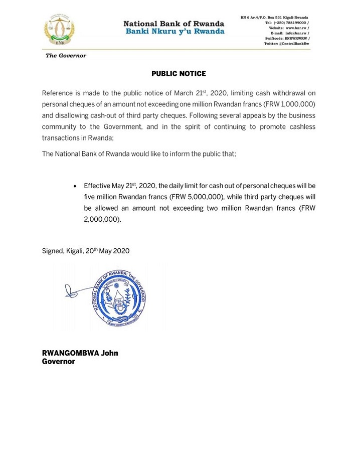 Banki Nkuru y’u Rwanda (BNR), yatangaje ko guhera kuri uyu wa Kane tariki 21 Gicurasi 2020, umuntu ukoresha sheki ye ku giti cye yemerewe kubikuza amafaranga y’u Rwanda miliyoni eshanu, avuye kuri miliyoni imwe ku munsi.
