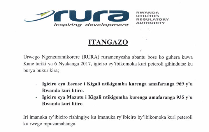 Iri tangazo ryasohotse kuri uyu wa 5 Nyakanga 2017, riragira riti " Igiciro cya Essence i Kigali ntikigomba kurenza 969 frw kuri litiro. Icya Mazutu ntikigomba kurenza 935Frw kuri Litiro".