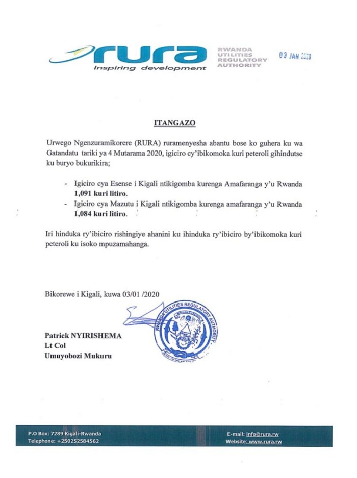 Iri hinduka ry’ibiciro rishingiye ahanini ku ihinduka ry’ibiciro by’ibikomoka kuri peteroli ku isoko mpuzamahanga, nk’uko itangazo ryashyizweho umukono n’Umuyobozi wa RURA, Lt Col Patrick Nyirishema, ribivuga.