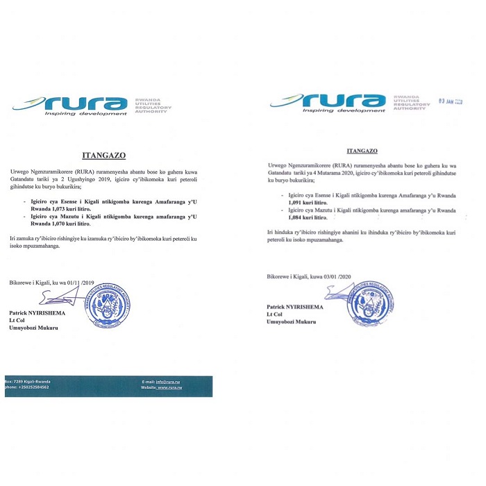 Ugereranyije n’igihe ibi biciro byaherukaga guhindukira mu kwezi k’Ugushyingo 2019, biragaragara ko byazamutse, aho Lisansi yavuye ku mafaranga 1,073 kuri litiro ikajya ku 1091, naho Mazutu iva ku mafaranga 1070 kuri litiro ijya ku mafaranga 1084 i Kigali.