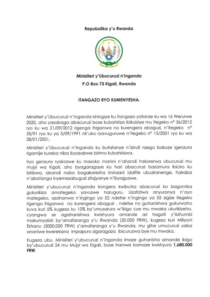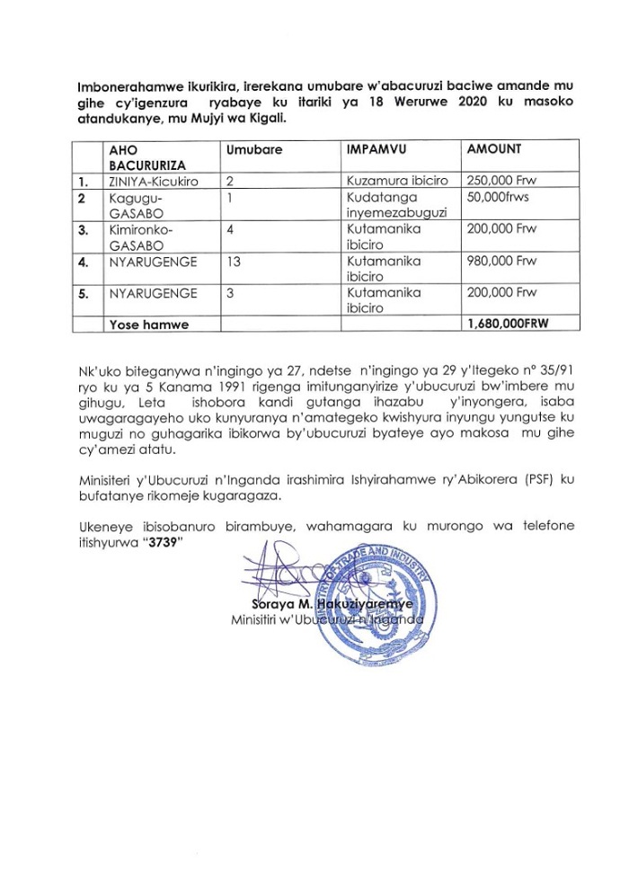 Ubutumwa buri mu itangazo Ministeri y’Ubucuruzi n’Inganda yashyize kuri Twitter bugira buti; “Turamenyesha Abaturarwanda bose ko mu rwego rwo kurengera abaguzi hakozwe igenzura ku kibazo cy’abazamura ibiciro muri ibi bihe ndetse hanafatwa ibyemezo bikurikira: