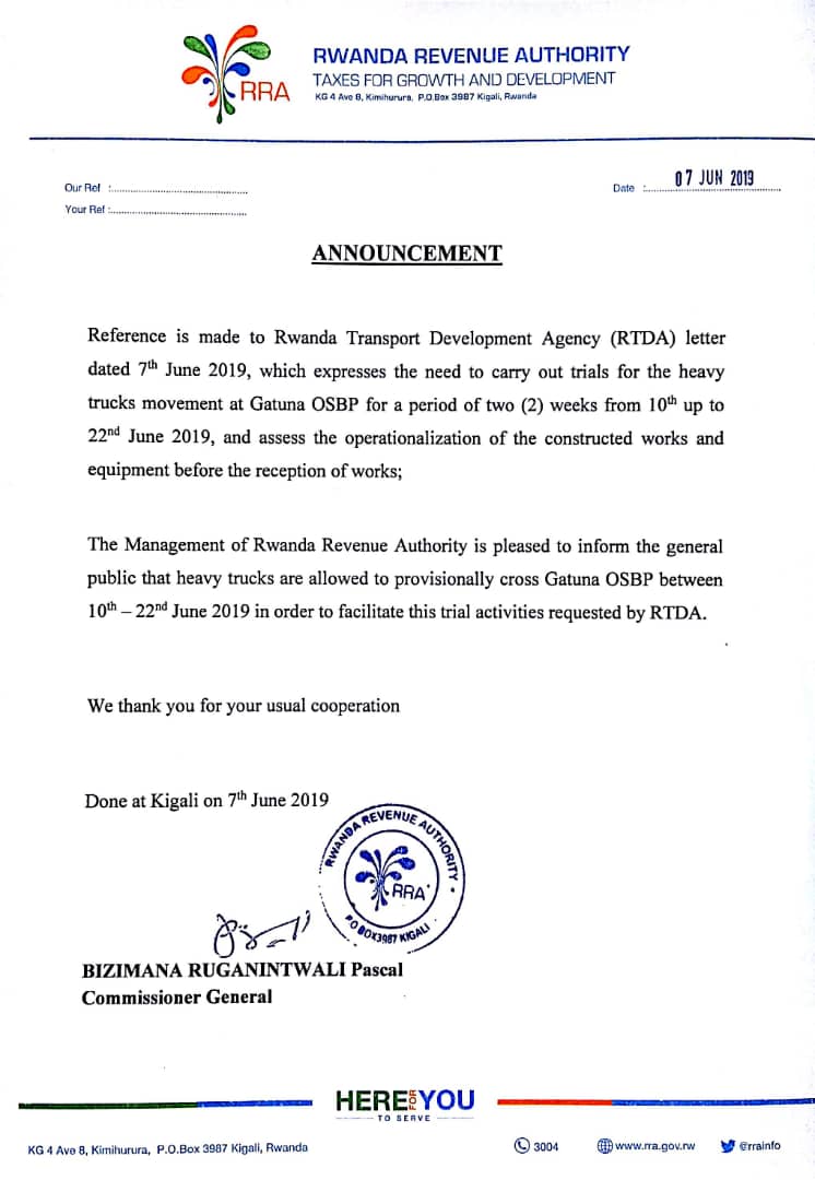 Iyo baruwa ivuga ko ubu noneho ku mupaka wa Gatuna amakamyo aremereye yakwemererwa gutambuka mu gihe cy’ibyumweru bibiri, mu rwego rwo gusuzuma niba imirimo yo kuvugurura uwo mupaka yaragenze neza.