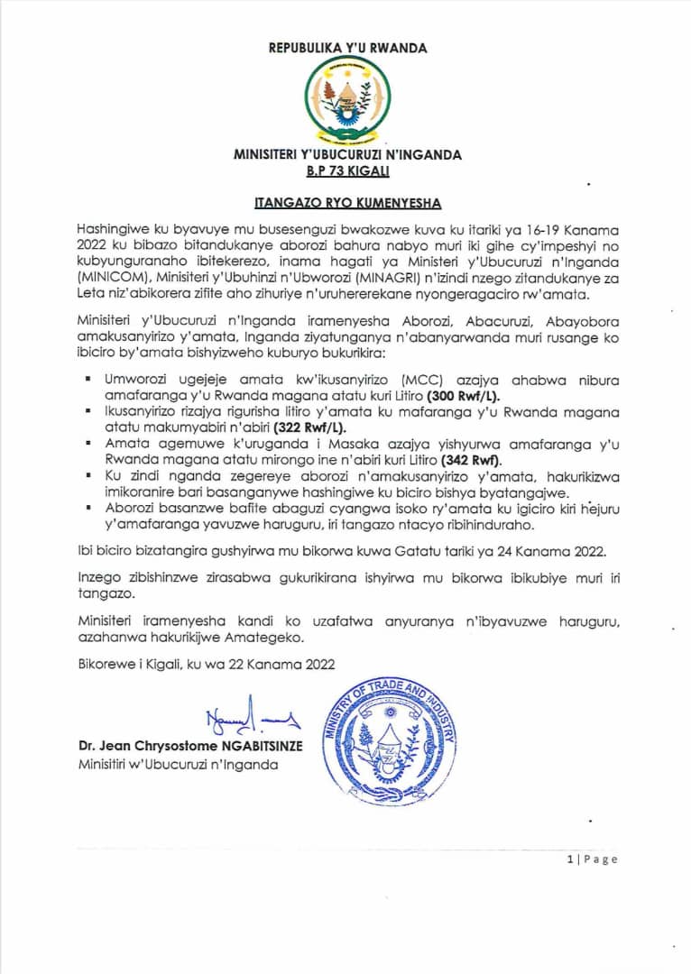 Iyi Minisiteri ikomeza ivuga ko aborozi basanzwe bafite abaguzi cyangwa isoko ry’amata ku giciro kiri hejuru y’amafaranga yavuzwe, iri tangazo ntacyo rihinduraho.