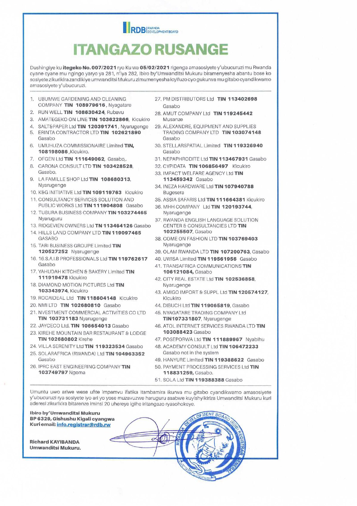 Itangazo rya RDB rigira riti “Dushingiye ku itegeko No 007/2021 ryo ku wa 05/02/2021 rigenga amasosiyete y’ubucuruzi mu Rwanda cyane cyane mu ngingo yaryo ya 281 n’iya 282 ibiro by’umwanditsi mukuru biramenyesha abantu bose ko sosiyete 51 zandikiye umwanditsi mukuru zimumenyesha icyifuzo cyo gukurwa mu gitabo cyandikwamo amasosiyete y’ubucuruzi”.