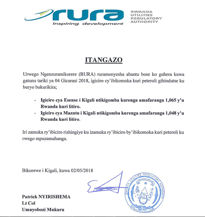 Ikigo ngenzuramikorere (RURA) cyatangaje ko ibiciro by’ibikomoka kuri Peteroli mu Rwanda byongeye kuzamuka.