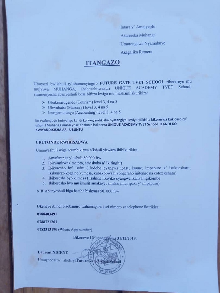 Ubuyobozi bw’Akarere ka Muhanga buratangaza ko ishuri ryigisha imyuga Unique TVET School, ryamaze gufunga imiryango, kandi ko iryitwa Future Gate TVET School riherutse guhamagarira abanyeshuri kurigana ritaremererwa gukora.