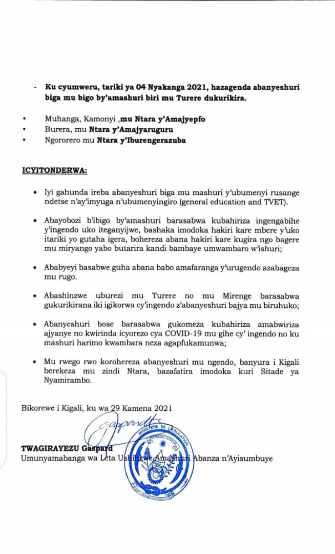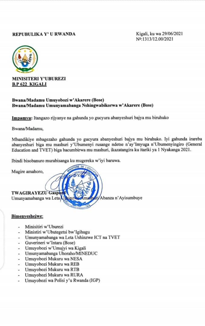 Minisiteri y’Uburezi (MINEDUC) yasohoye itangazo rigaragaza ingengabihe y’uko abanyeshuri biga bacumbikiwe bazajya mu biruhuko, aba mbere bakazataha kuri uyu wa Kane tariki 1 Nyakanga 2021, iryo tangazo rikaba rireba abanyeshuri batazakora ibizamini bya Leta.