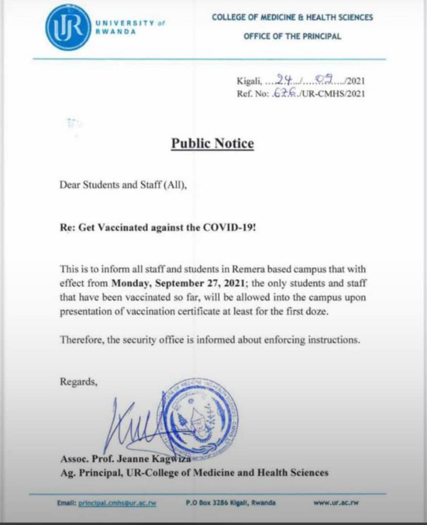 Mu itangazo ryasohowe na Kaminuza y’u Rwanda tariki 24 Nzeri 2021, rigira riti “Turamenyesha abakozi bose n’abanyeshuri ba Kaminuza y’u Rwanda, ishami ryayo riherereye i Remera, ko guhera ku wa Mbere tariki 27 Nzeri 2021, abanyeshuri n’abakozi bakingiwe nibura urukingo rwa mbere kugeza ubu, ari bo bazemererwa kwinjira muri Kaminuza babanje kwerekana icyemezo ko bakingiwe. Ibiro bishinzwe umutekano byamenyeshejwe kugira ngo bikurikirane ishyirwa mu bikorwa ry’ayo mabwiriza”.